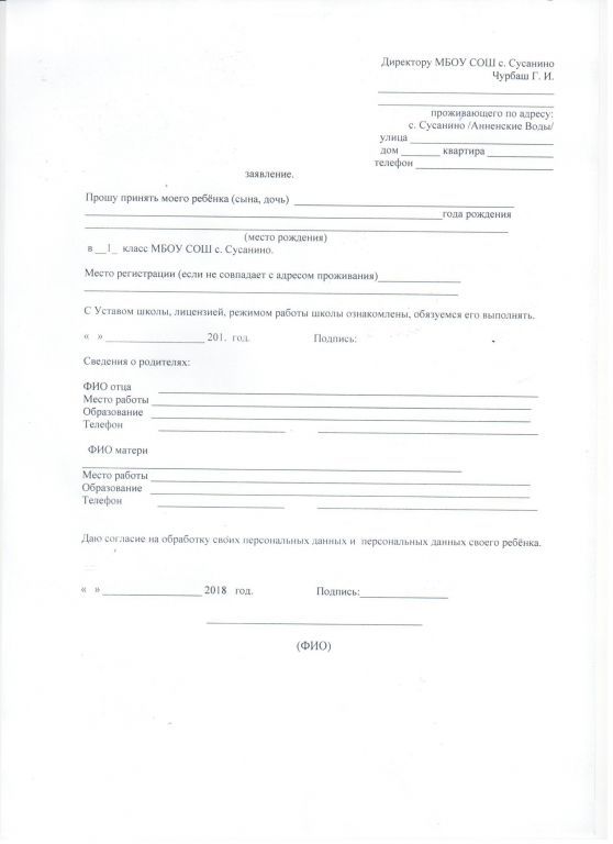 Форма заявления родителей (законных представителей) о приеме ребенка в общеобразовательной организации